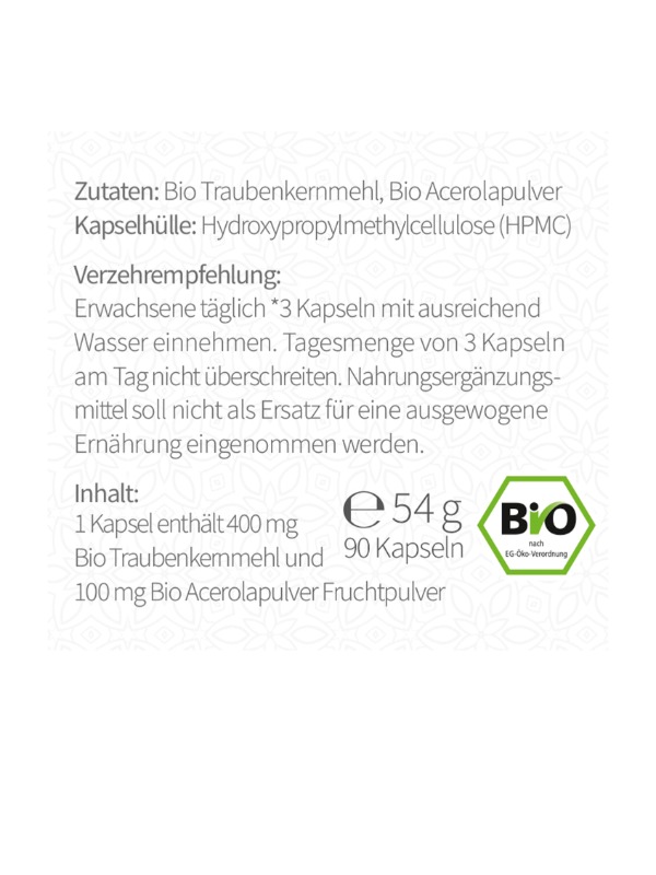 90 Kapseln = 54 g , 1 Kapsel enthält 400 mg Bio Traubenkernmehl und 100 mg Bio Acerolapulver Fruchtpulver