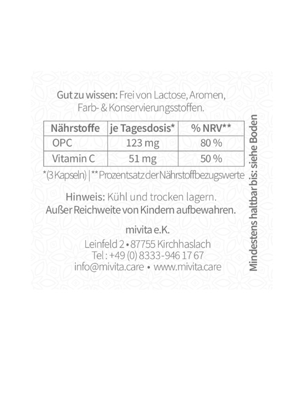 Da OPC die Aufnahme von Vitamin C bis zu 10% erhöhen kann, enthalten MIVITA Bio OPC Kapseln Acerola Fruchtpulver mit mindestens 17% Vitamin C Gehalt. Diese Kombination macht sie zu einem hervorragenden Produkt, um Ihren Körper mit OPC und Vitamin C zu unterstützen.